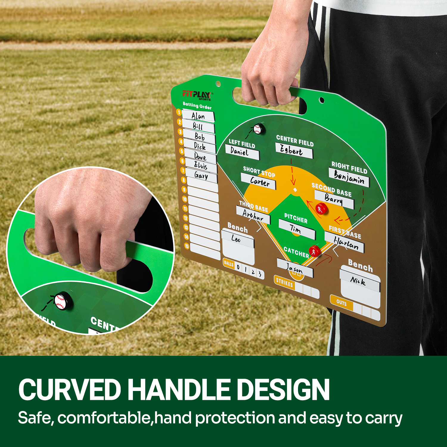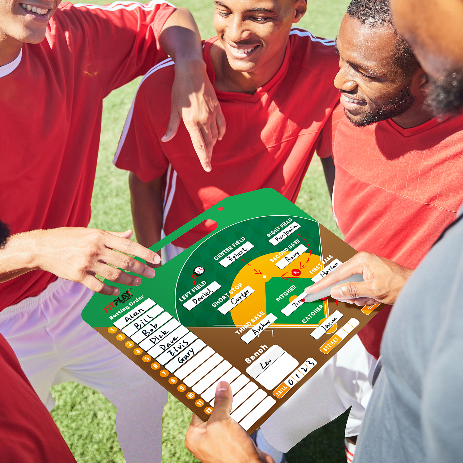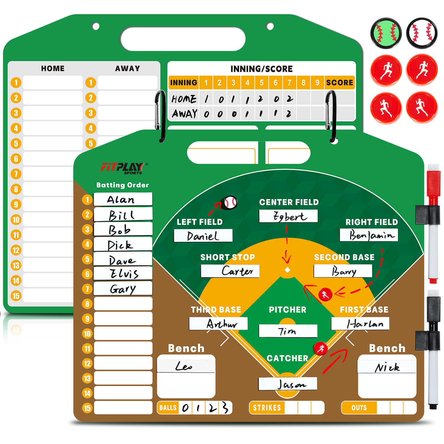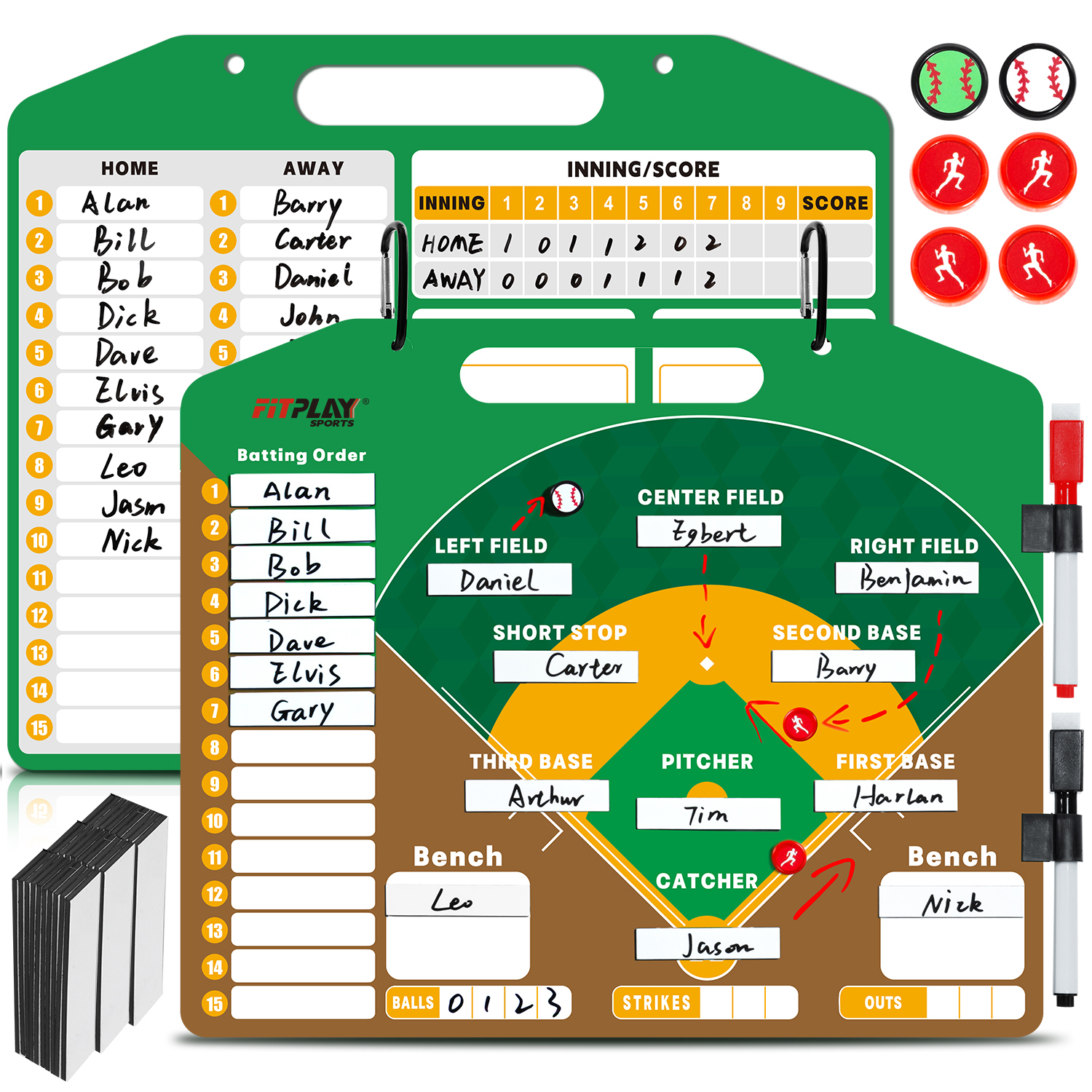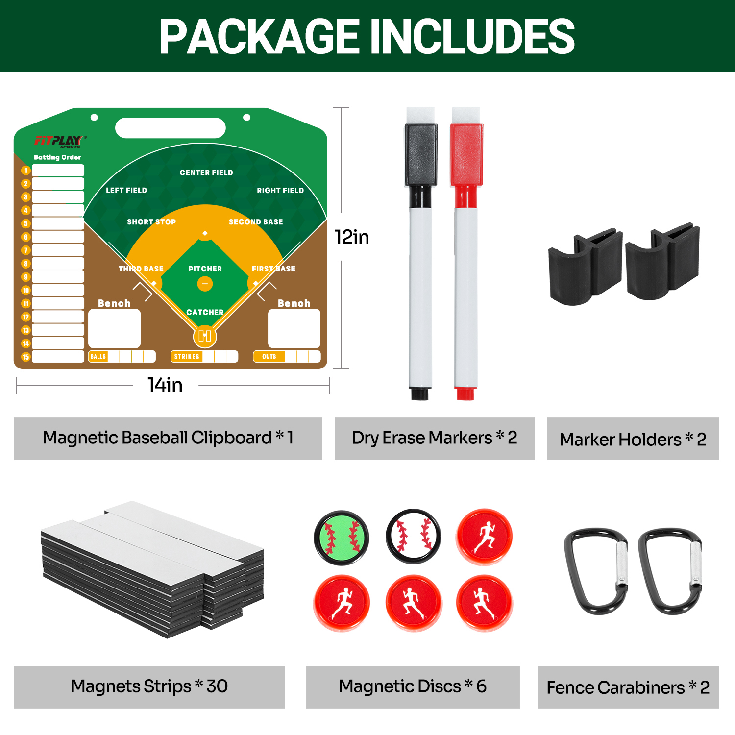 Includes 2 dry-erase markers, 1 baseball, 1 softball, and 4 base runner discs.