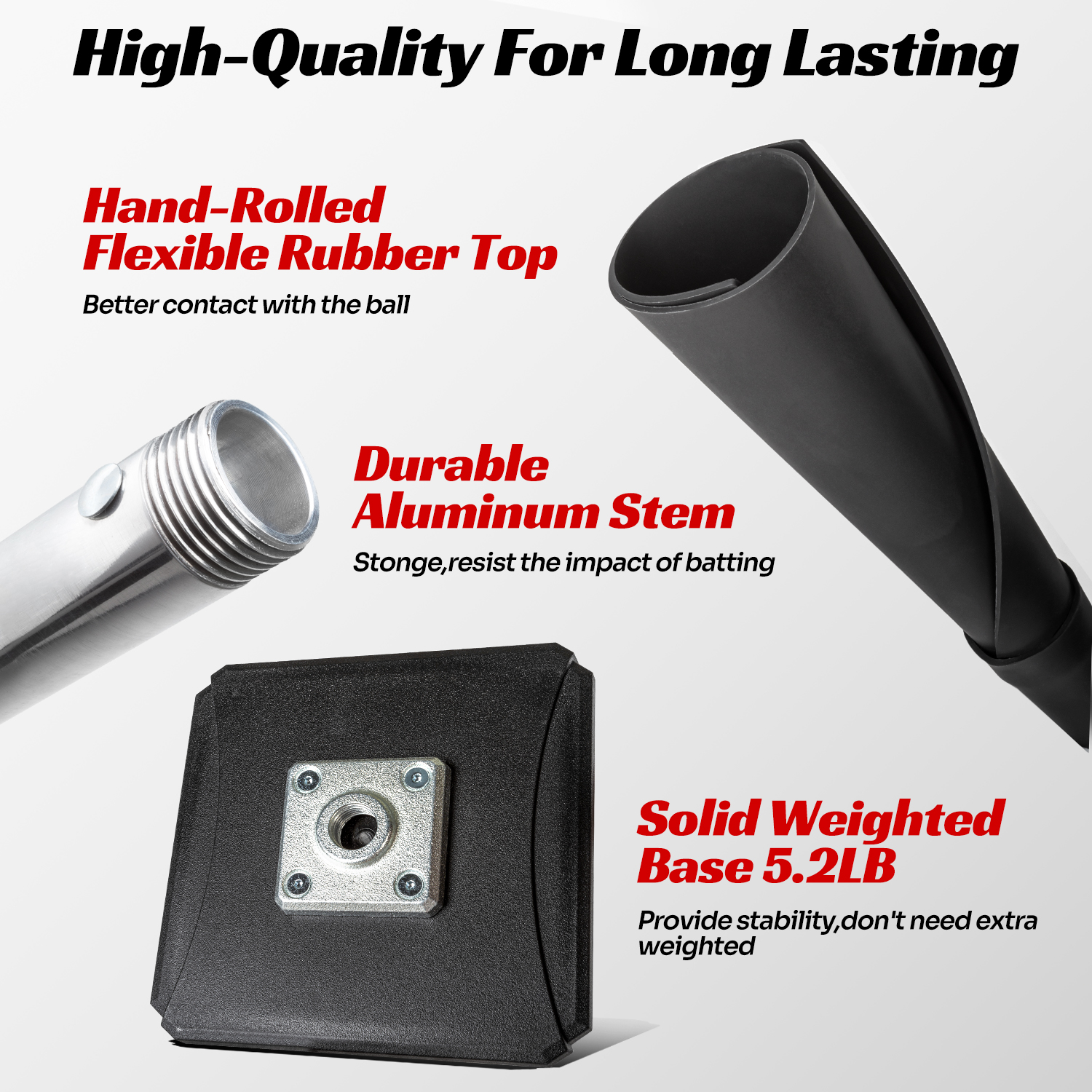 5.2 lbs heavy-duty metal base with flexible rubber top for stable, improved ball contact