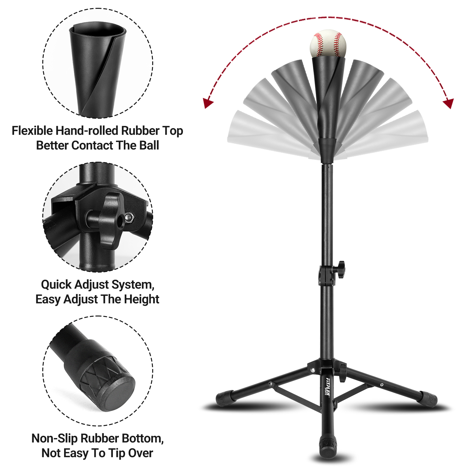 Flexible rubber top and stable tripod base for consistent ball contact