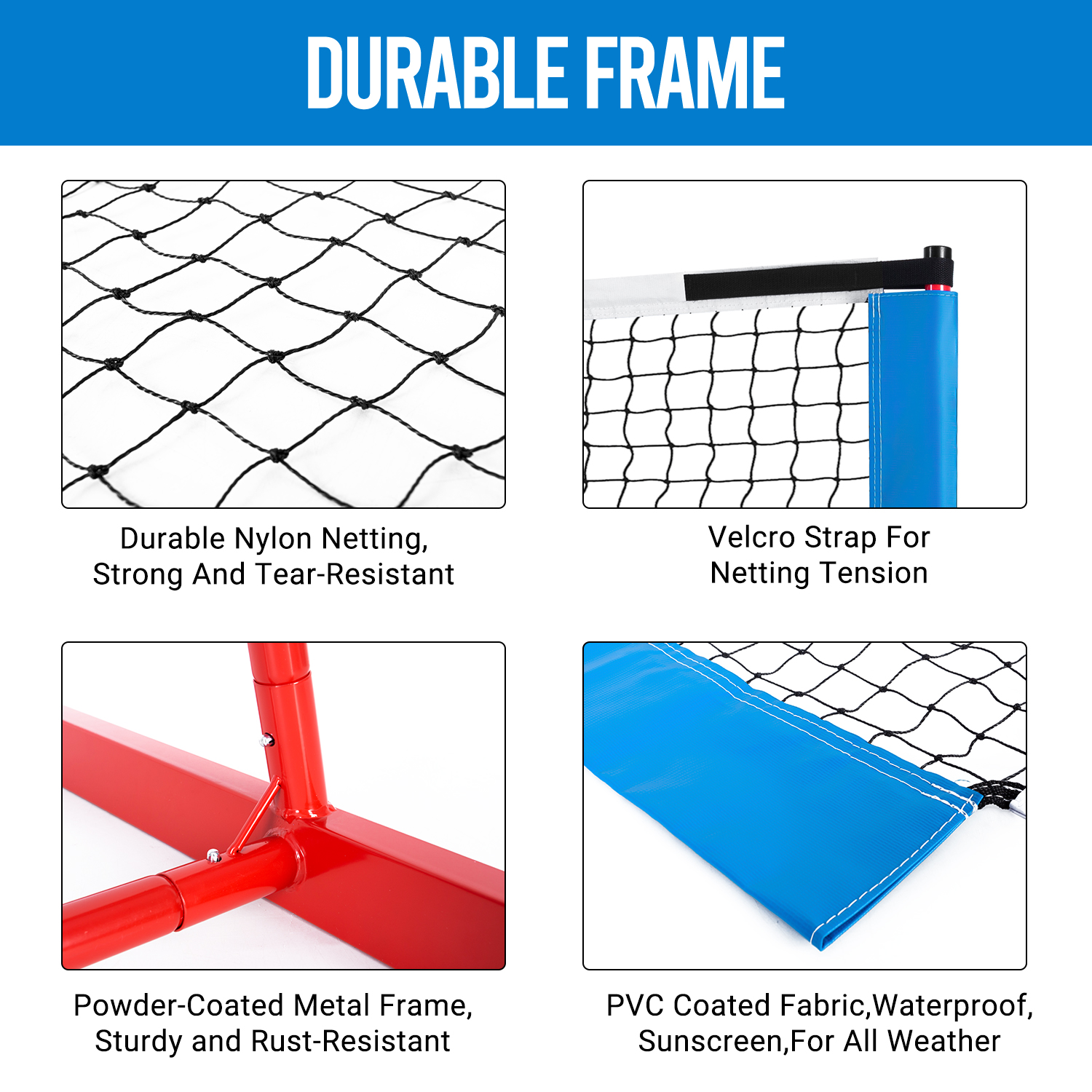 Durable, all-weather steel frame and nylon net for indoor/outdoor use