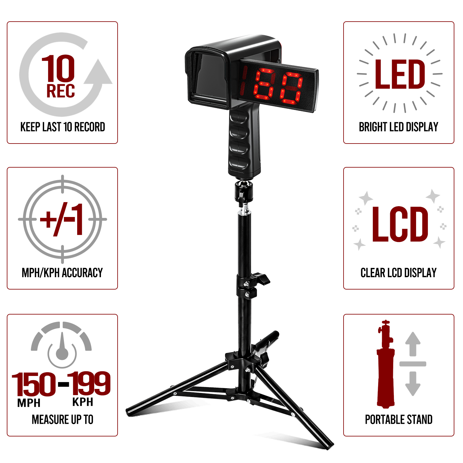 Radar tracks 3–150 mph with ±1 mph accuracy, stores 10 records, supports handheld or tripod use