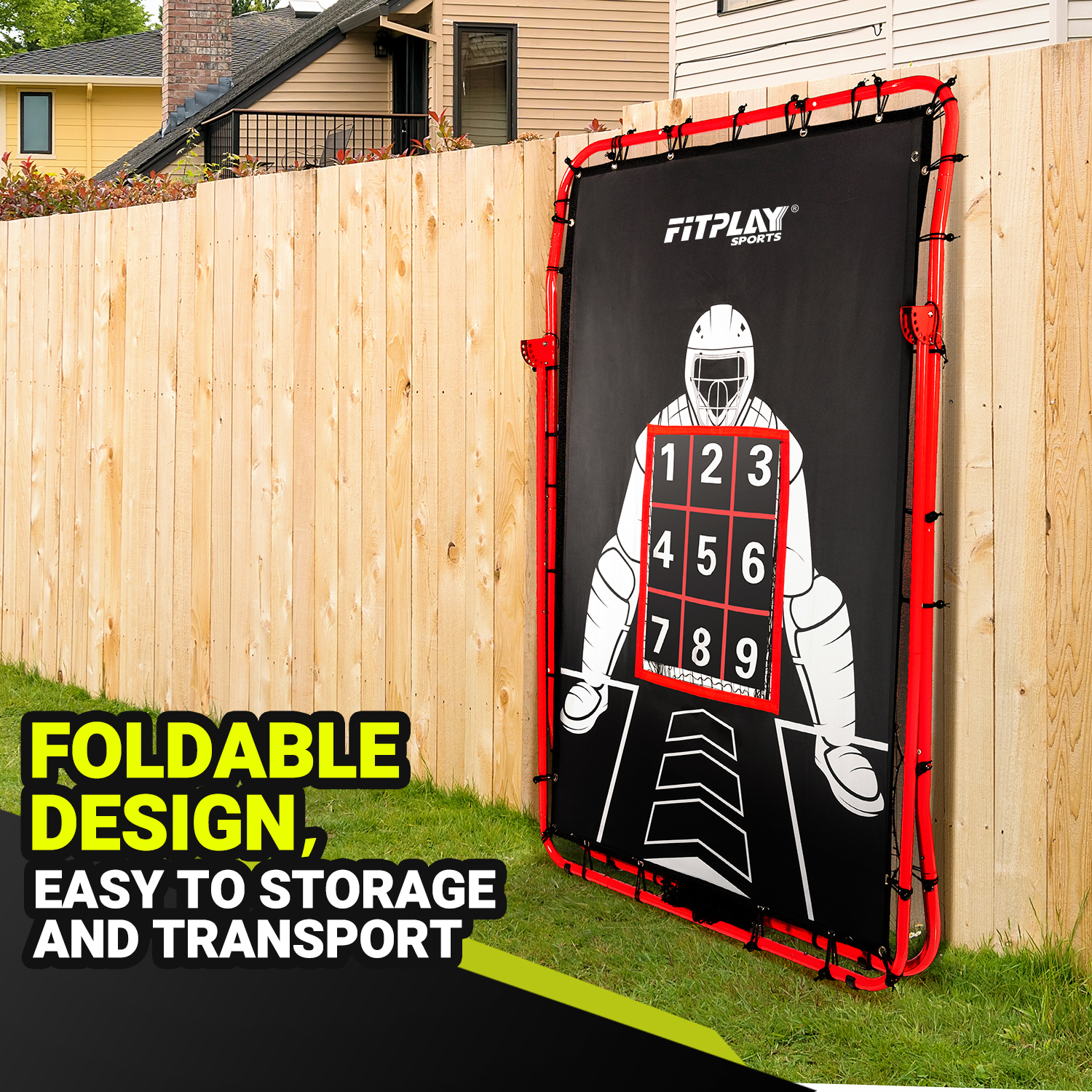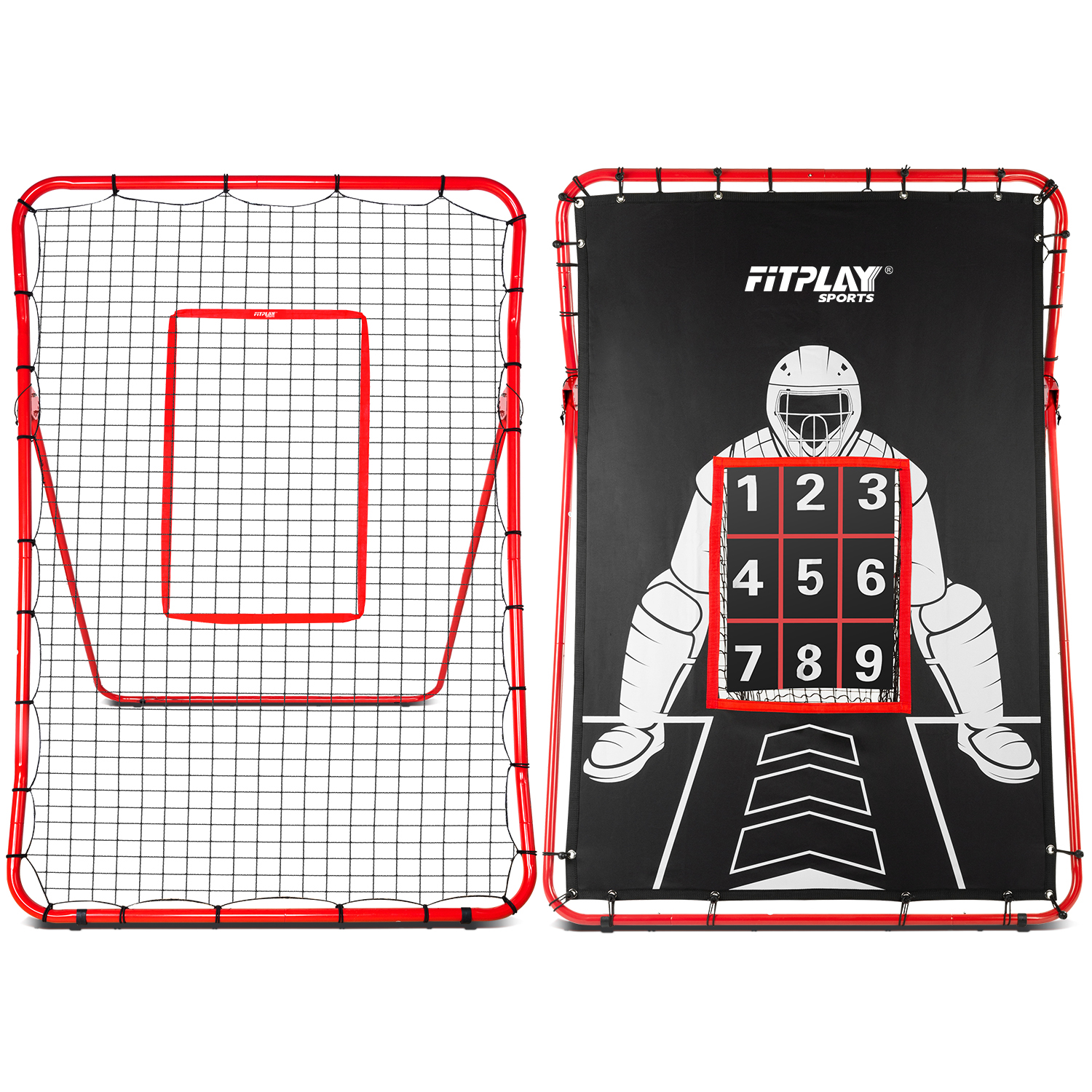 2-in-1 pitching target and rebounder net trains pitching, catching, and fielding skills.