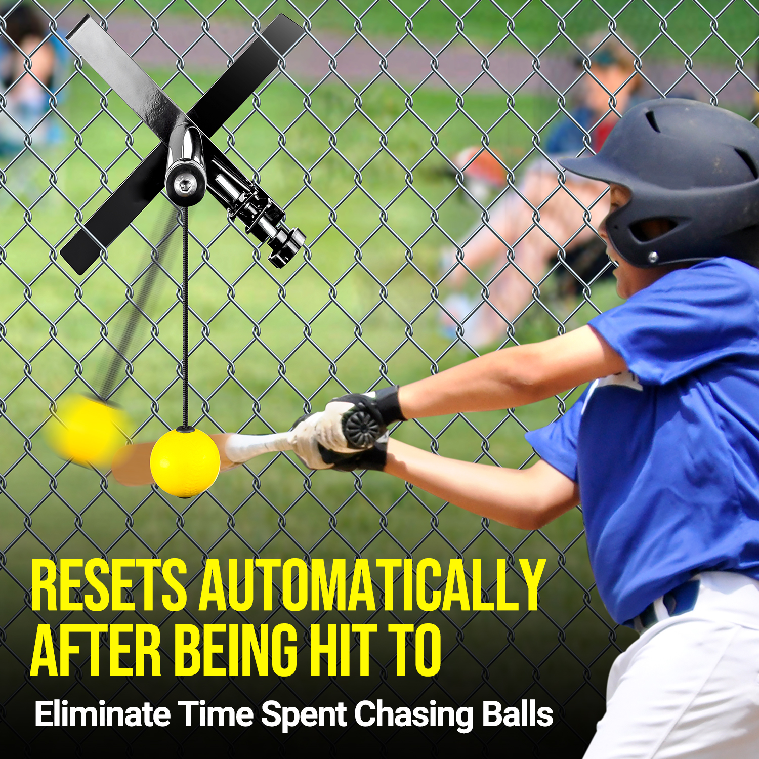 Solo swing trainer with tethered ball for continuous reps and instant feedback