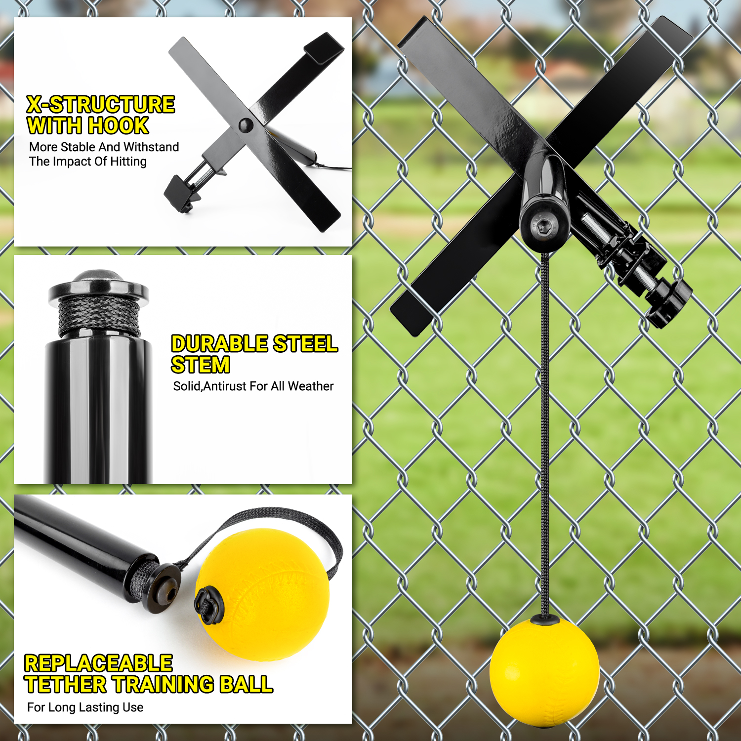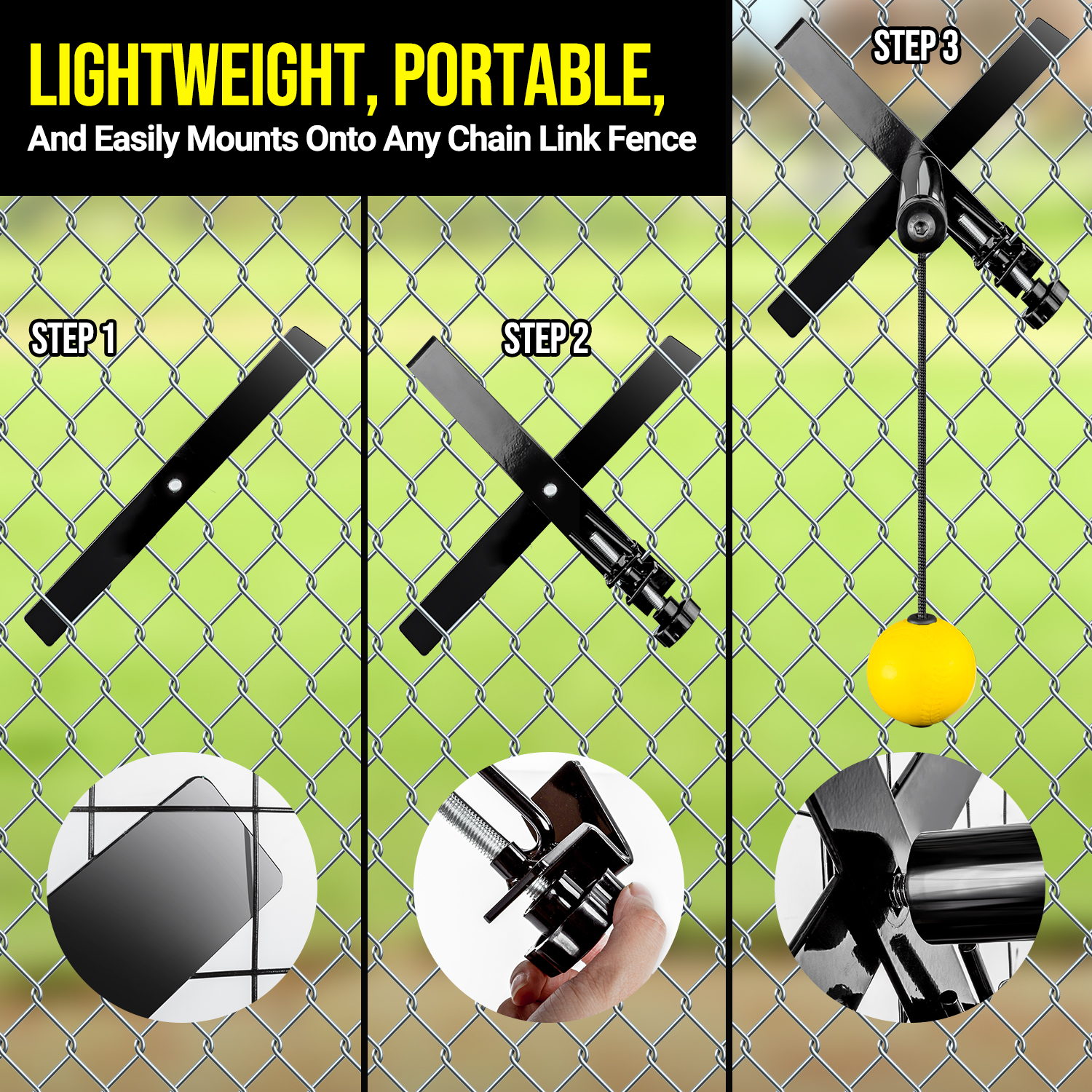 Durable metal construction, lightweight and portable, mounts to any chain link fence