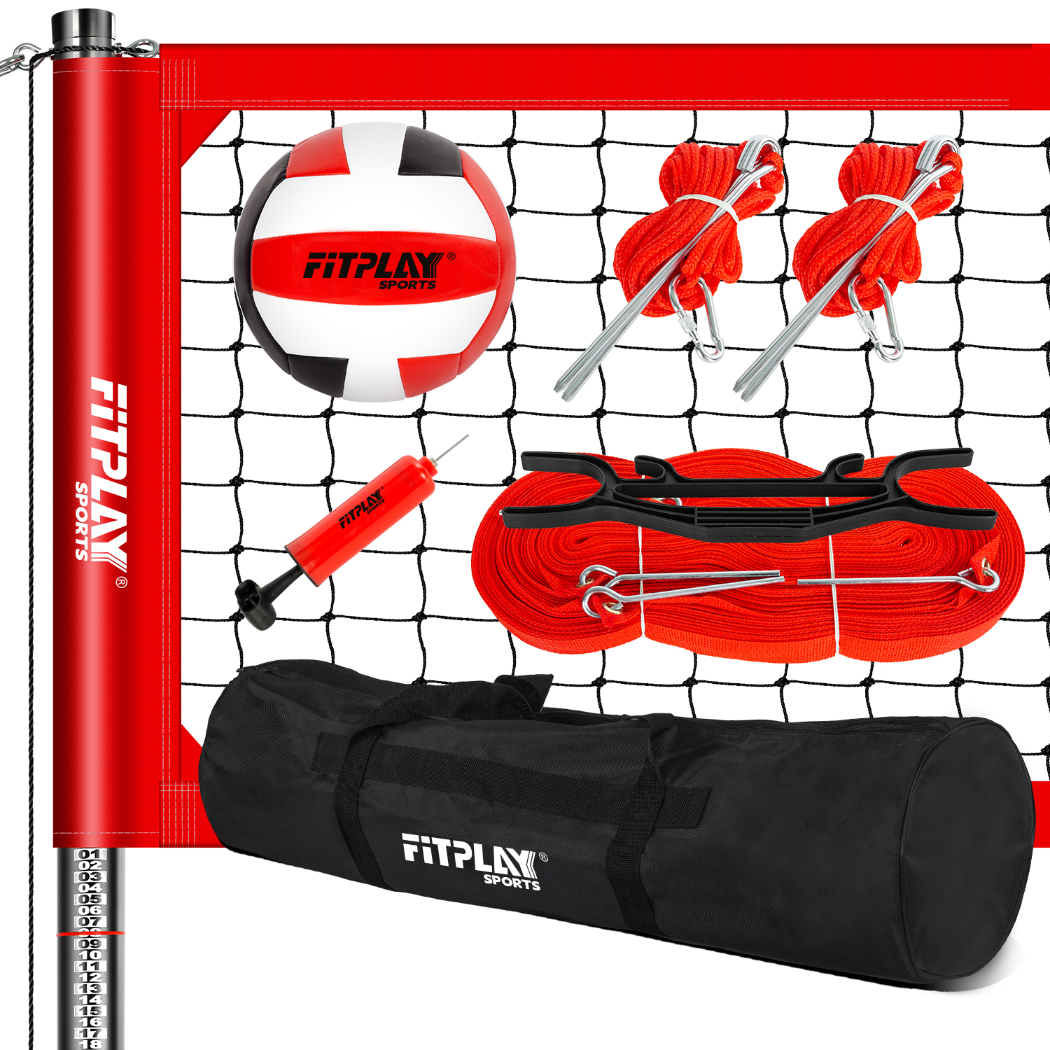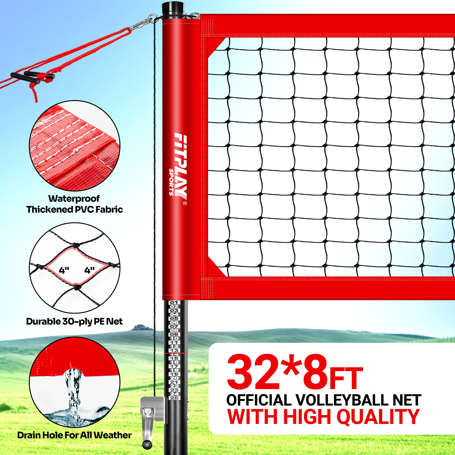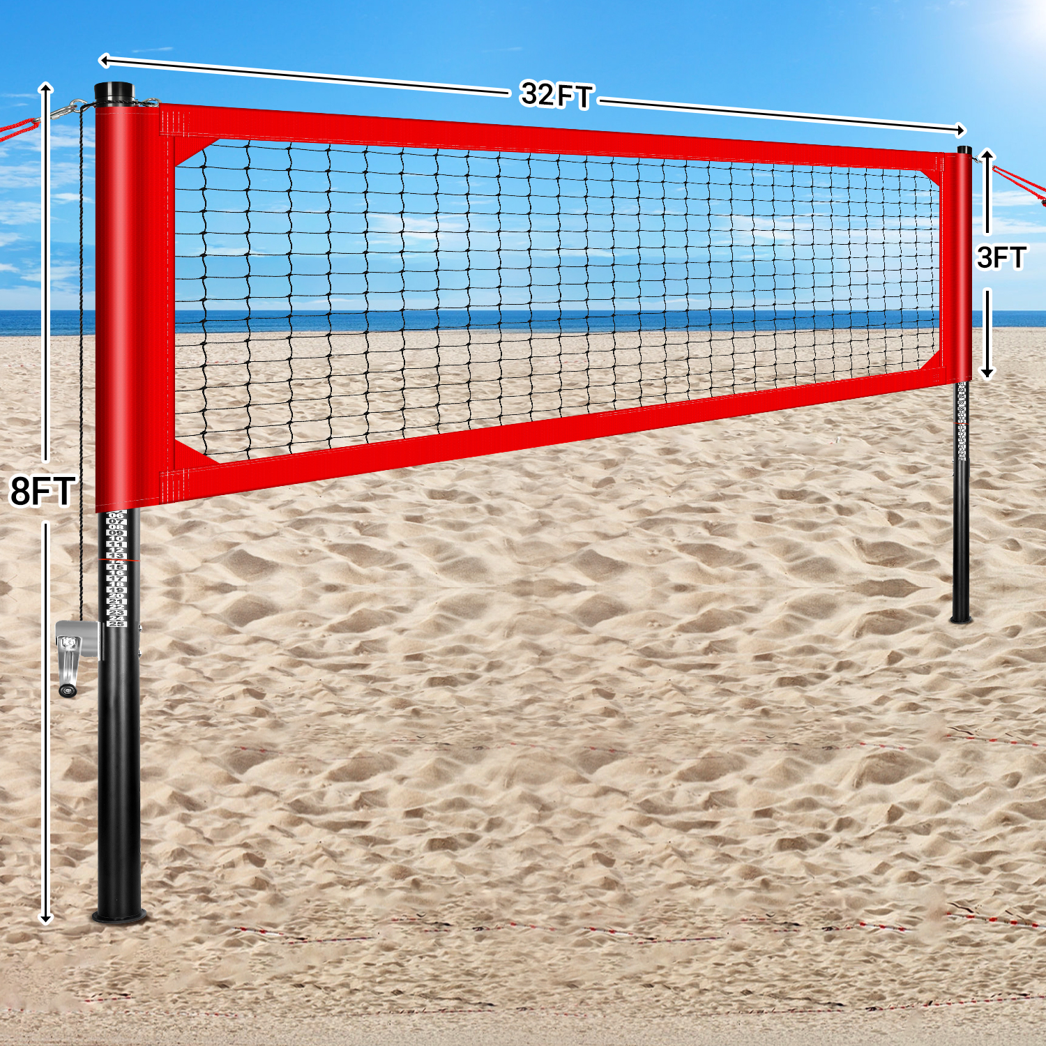 Official-size 32’×3’ PE nylon volleyball net with reinforced sleeves and straps for outdoor use.